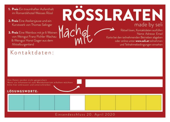 Freuen sie sich über tolle Preise von der Rösslwirtin, den Editionswinzern Gager und Pichler und dem Künstler Seli