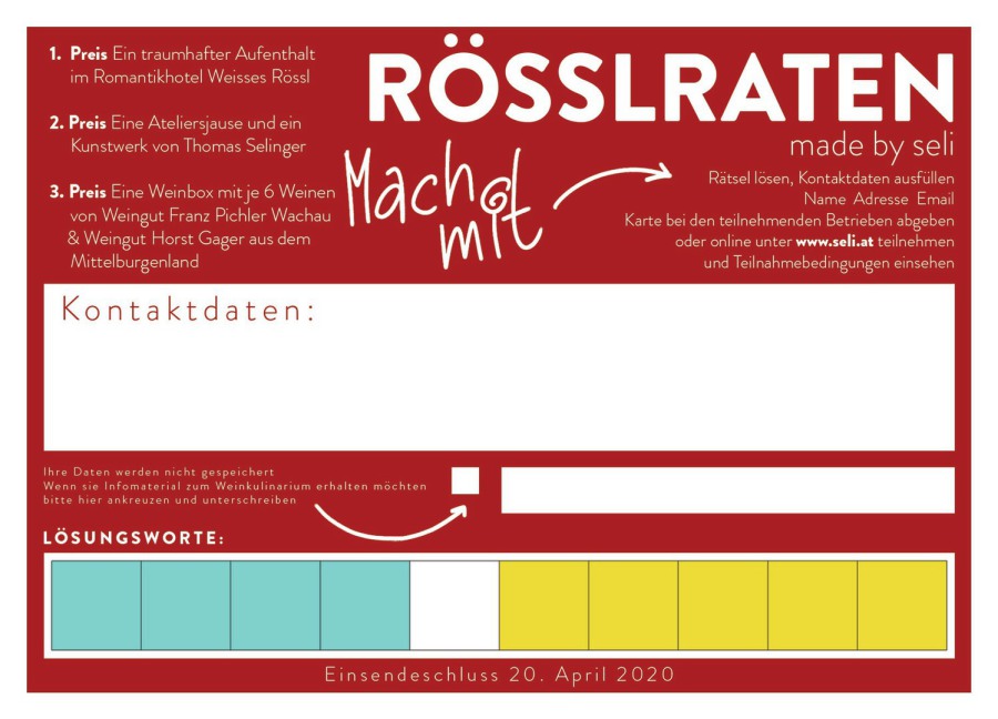Horst Gager Mittelburgenland und Atelier Thomas Selinger Salzburg mitspielen und die Karte dort abgeben oder sie nehmen online hier teil und füllen das