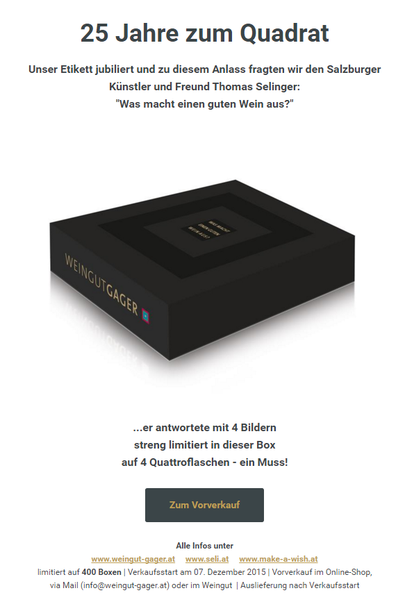 Thomas Selinger und Horst Gager haben sich zusammengetan und eine Spendenaktion in die Welt gerufen die seinesgleichen sucht. Kunst am und im Wein im Zuge des 25 Jahre Jubiläums vom Wein Quattro aus dem Hause Gager, das Flagschiff des Weingutes sozusagen.